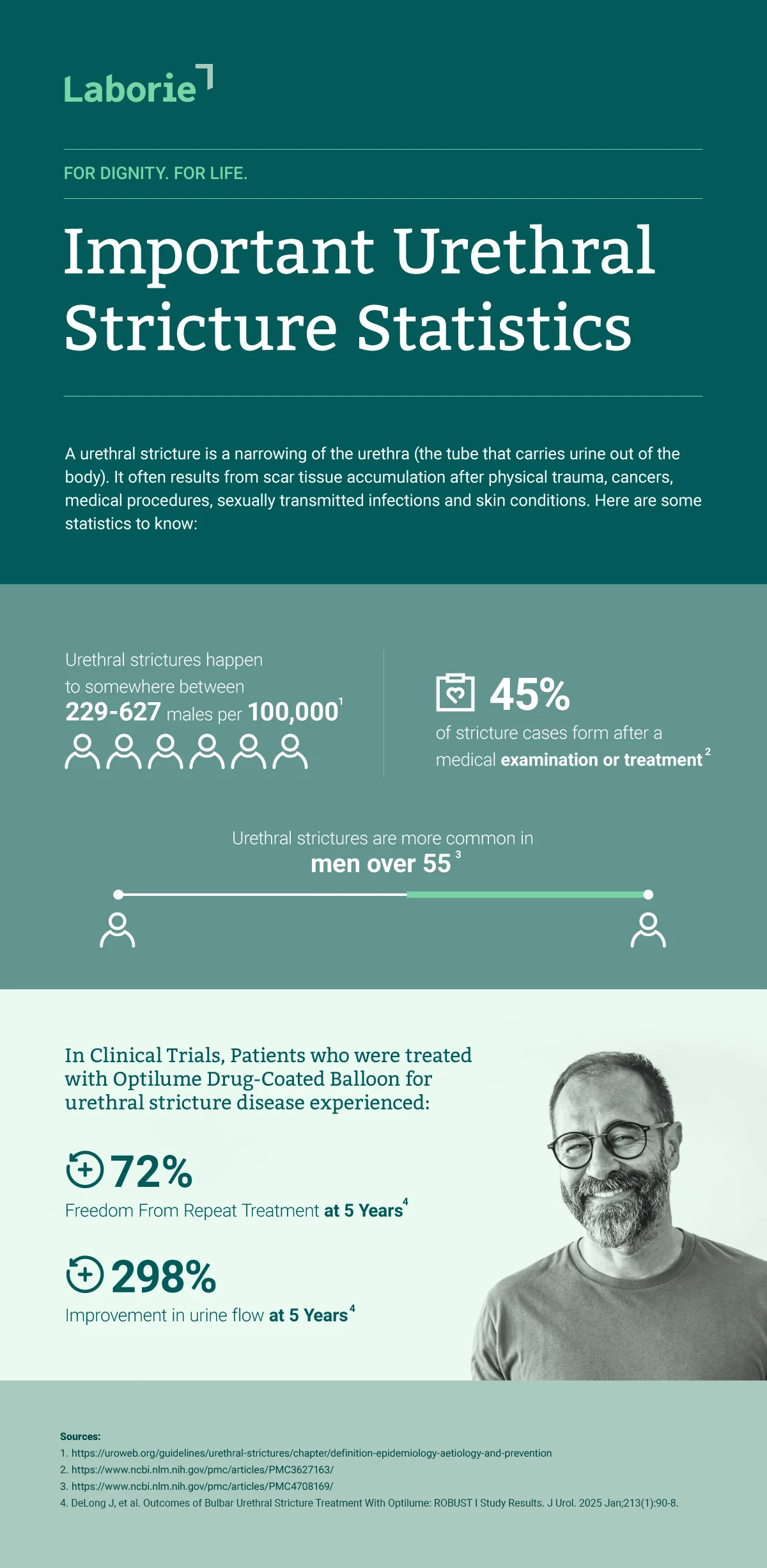 For patients who have failed prior endoscopic treatment, today there is Optilume® — a breakthrough urethral drug-coated balloon treatment that dilates the urethral lumen and delivers paclitaxel directly to the stricture, significantly reducing the incidence of stricture recurrence.1,2