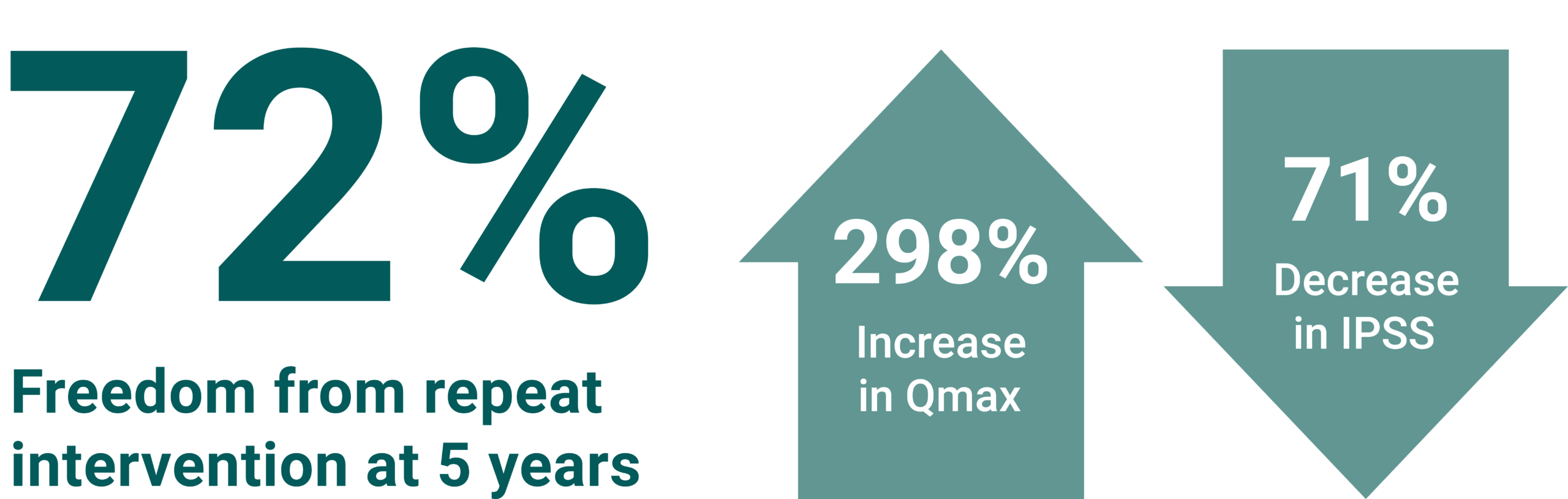 At 5 years, durability continued with 72% FFRI* 1, with a 298% increase in Qmax* (Baseline 5mL, 5-year 19.9mL)¹ and a 71 decrease in IPSS* (Baseline 22.5, 5-year 7.2).¹ Qmax & IPSS are using FCF* rates – Includes worst observed value carried forward for subjects undergoing repeat intervention of the study stricture (i.e. clinical failures).